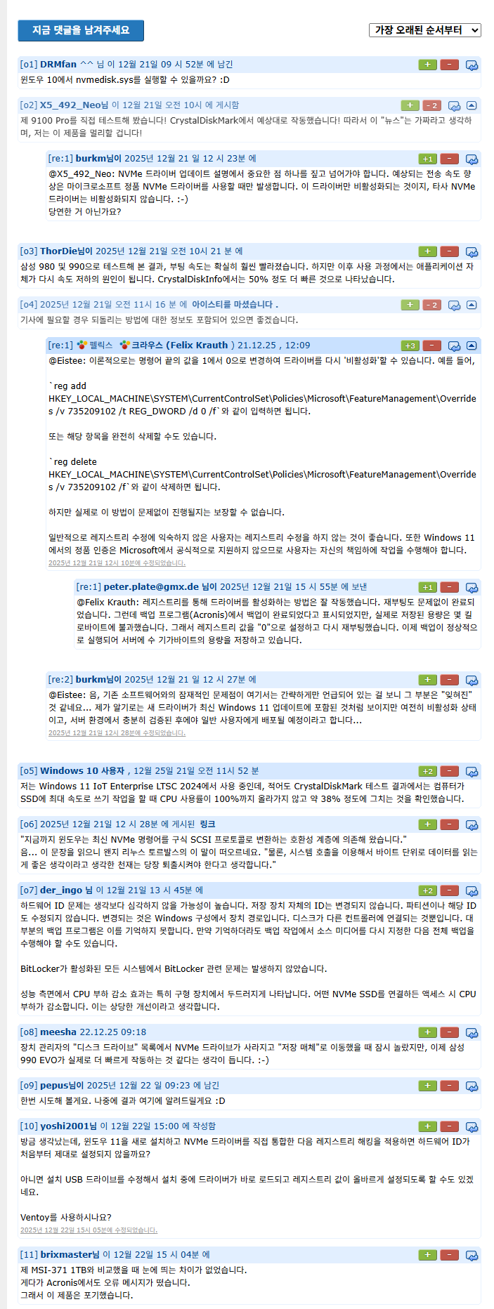 반드시 본문 제일 밑에 있는 Nvme 드라이버 제조사를 꼭 확인 바랍니다.!!!!!