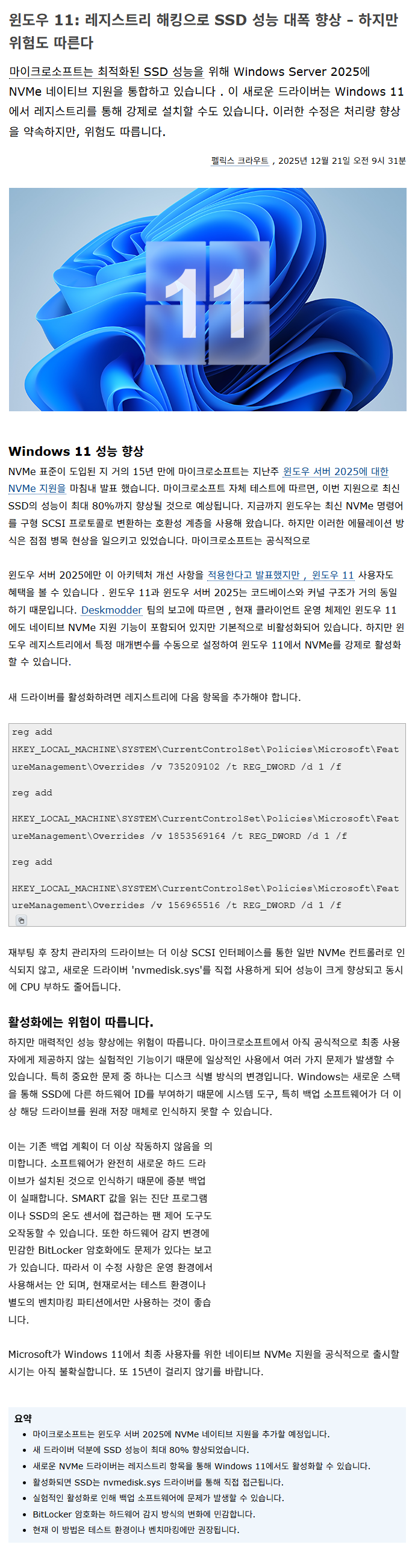 Windows 11 : 레지스트리 해킹으로 Nvme SSD 성능 대폭 향상시키는 방법