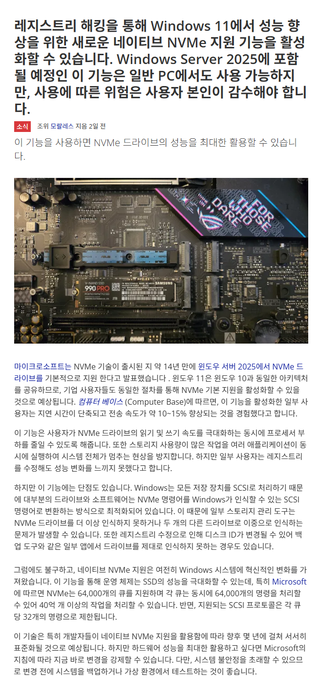 오로지 Nvme 드라이브로 변경해주는 방식으로 Nvme 속도를 향상시킨다고 합니다..