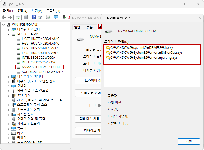 아래 처럼 Nvme 드라이버 정보에... StorNVMe.sys 파일이 없으면 실패합니다...
