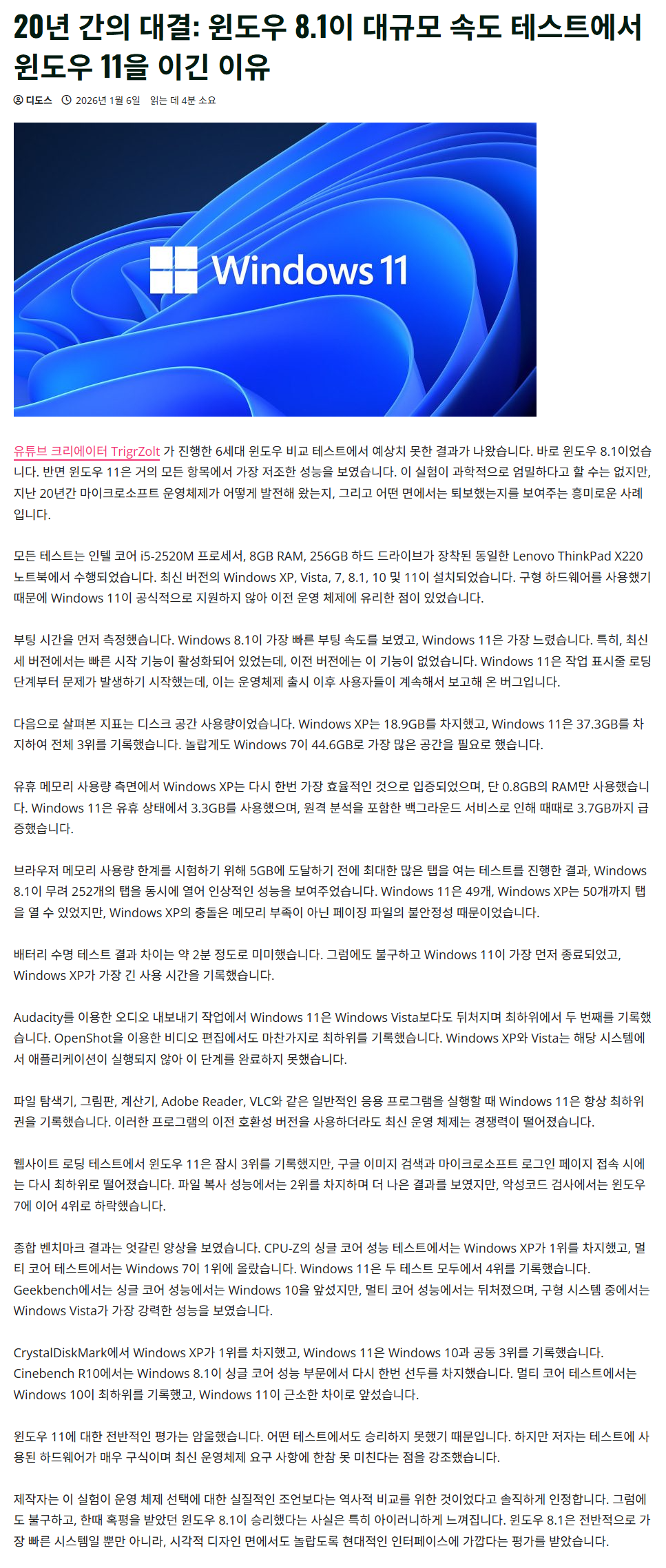 20년 간의 대결 : 윈도우 8.1이 대규모 속도 테스트에서 윈도우 11을 이긴 이유