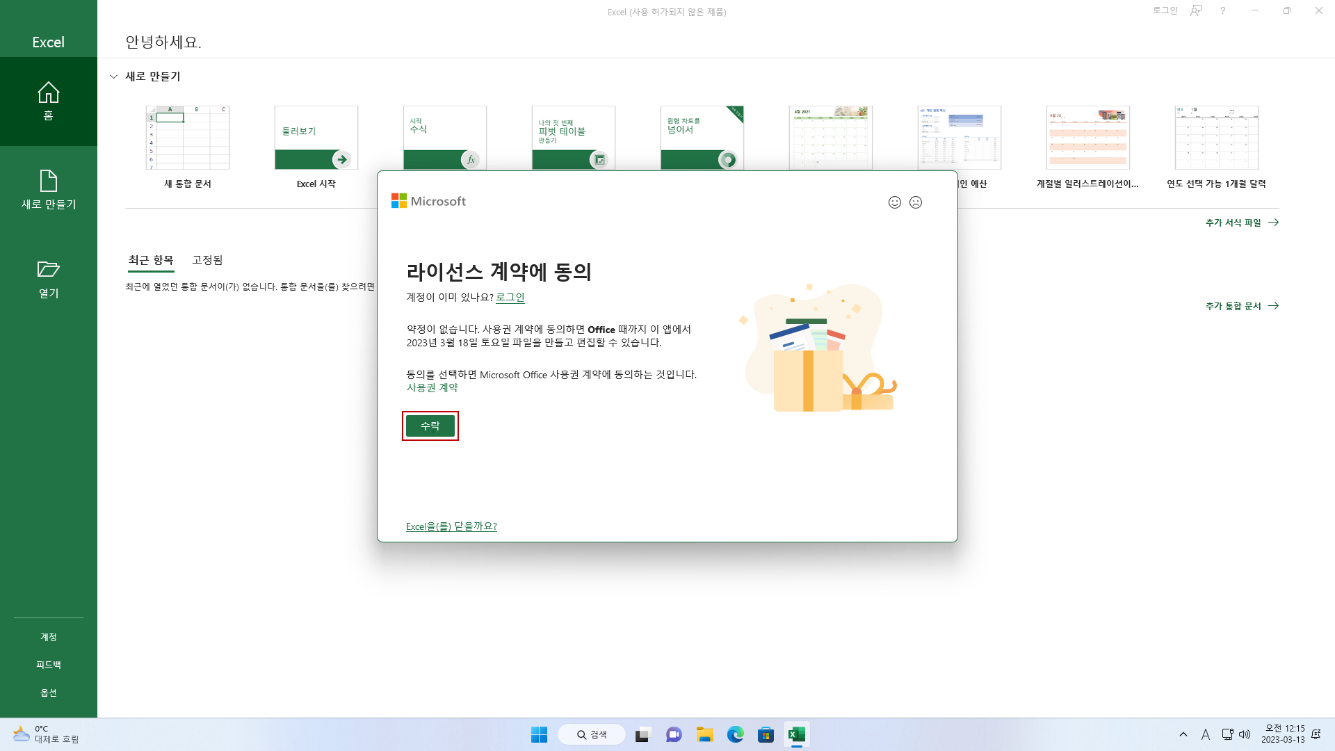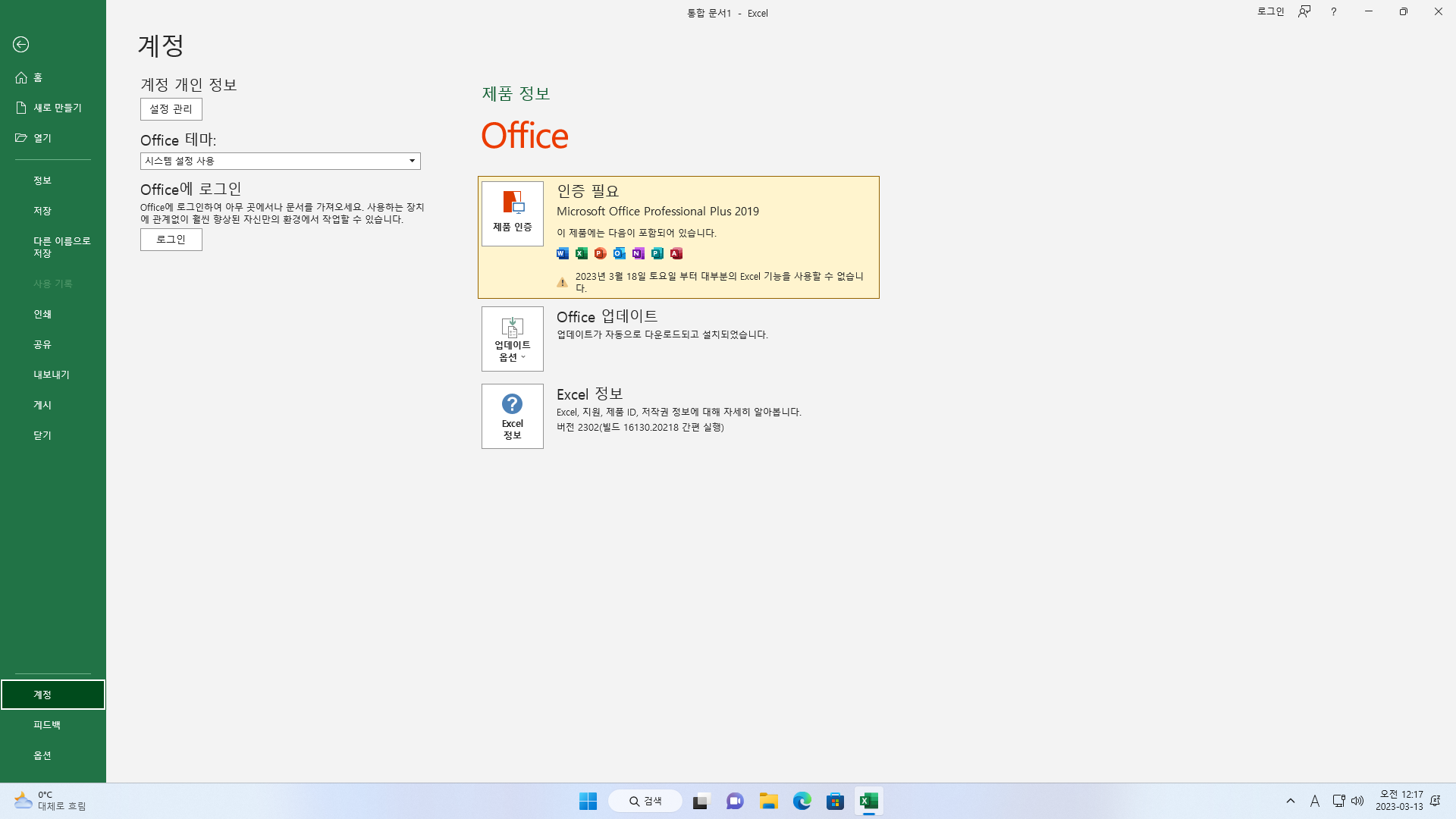 이 화면에서는 정품인증 여부와 Office 업데이트를 진행할 수 있습니다.