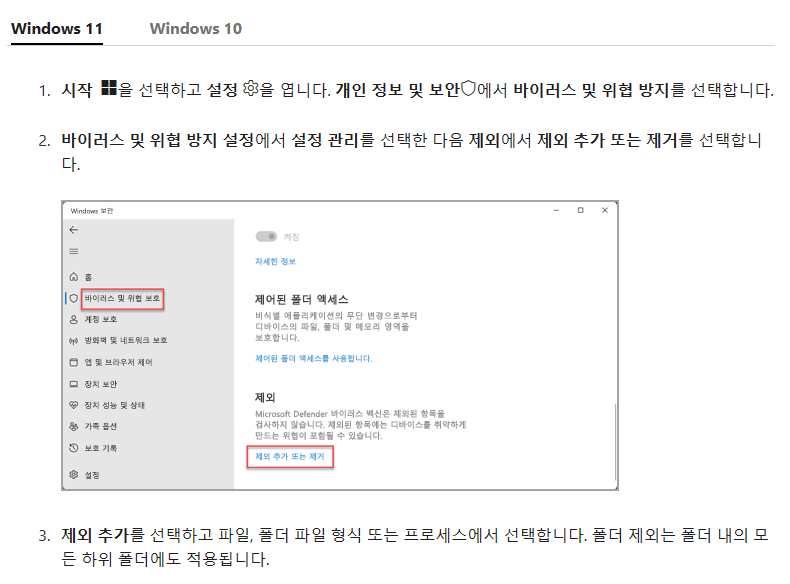 시작 → 설정 → 개인 정보 및 보안 → Windows 보안 → 바이러스 및 위협 방지 → 바이러스 및 위협 방지 설정 → 설정 관리