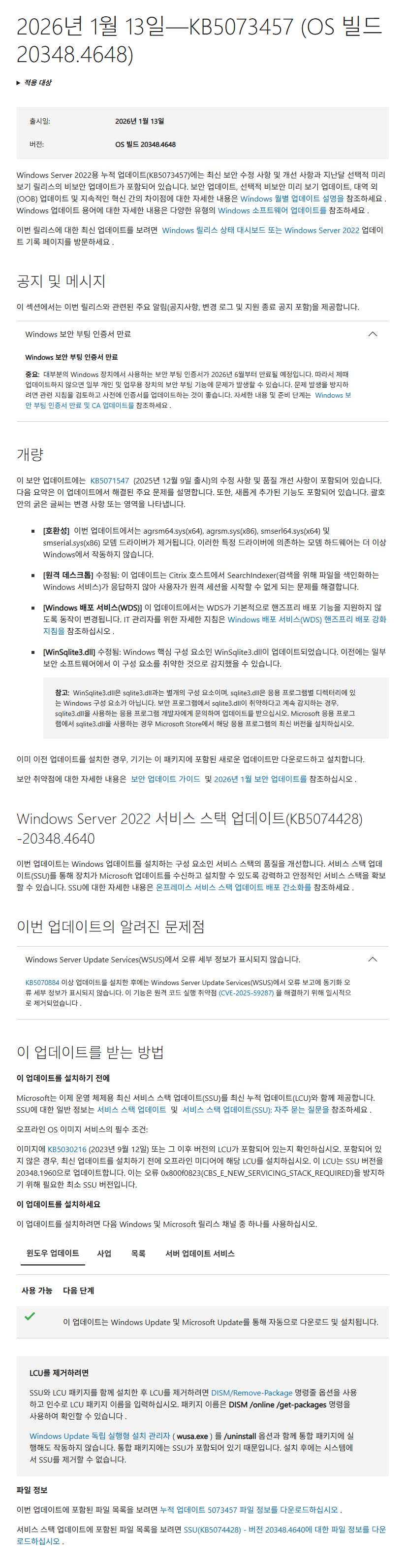 KB5073457 = 최신 누적 업데이트(20348.4648) (Last Cumulative Update : LCU) (2026-01-13)