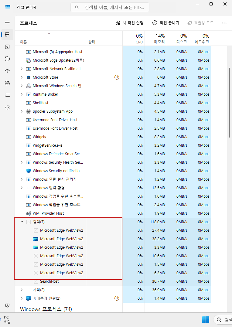 아래 처럼 윈도우를 설치하면 [작업관리자]에 Microsoft Edge Viewer2 프로세스가 7개 자동으로 돌아가고 있습니다.