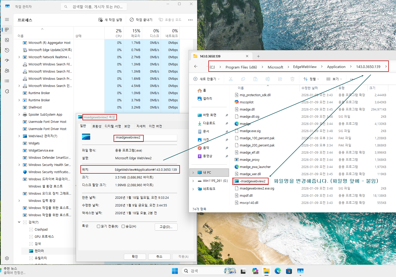 탐색기에서 해당 경로를 찾아들가서 msedgewebview2.exe 파일이 실행하지 못하도록 파일명을 변경해줍니다.
