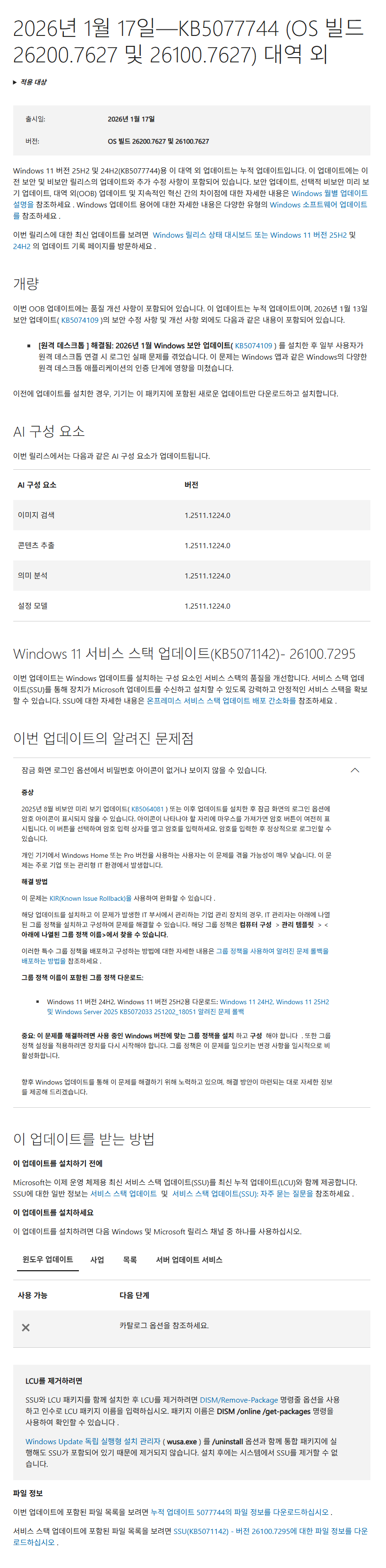 KB5077744 = 최신 누적 업데이트(26200.7627) (Last Cumulative update : LCU) (2026-01-17)