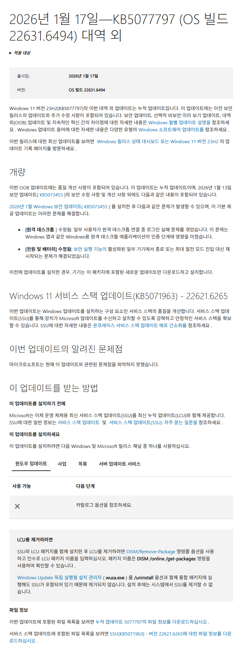 KB5077797 = 최신 누적 업데이트(22631.6494)) (Last Cumulative update : LCU) (2026-01-17)