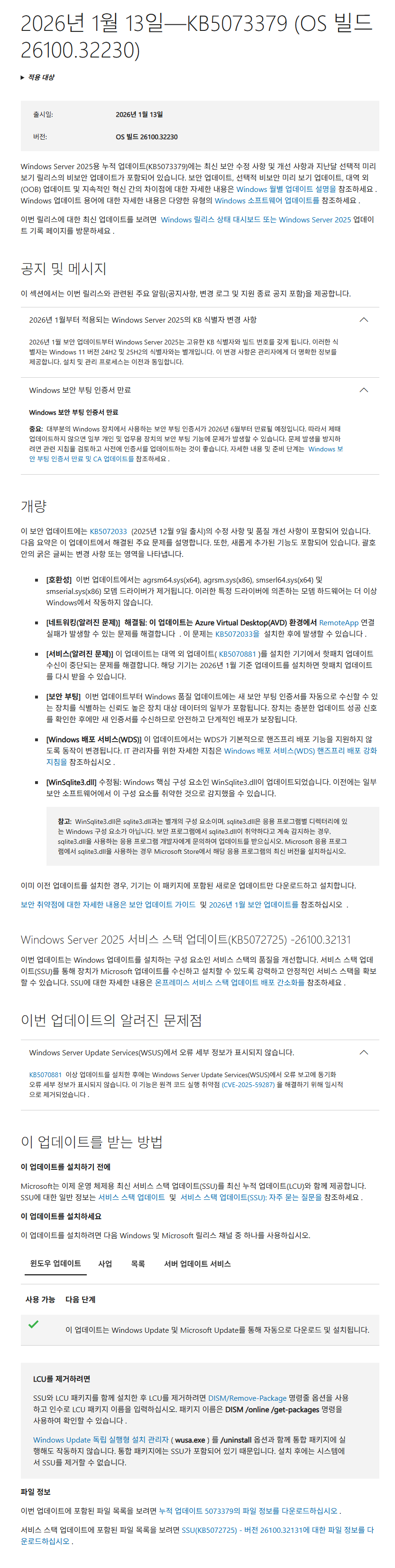 KB5073379 = 최신 누적 업데이트(26100.32230) (Last Cumulative update : LCU) (2026-01-13)