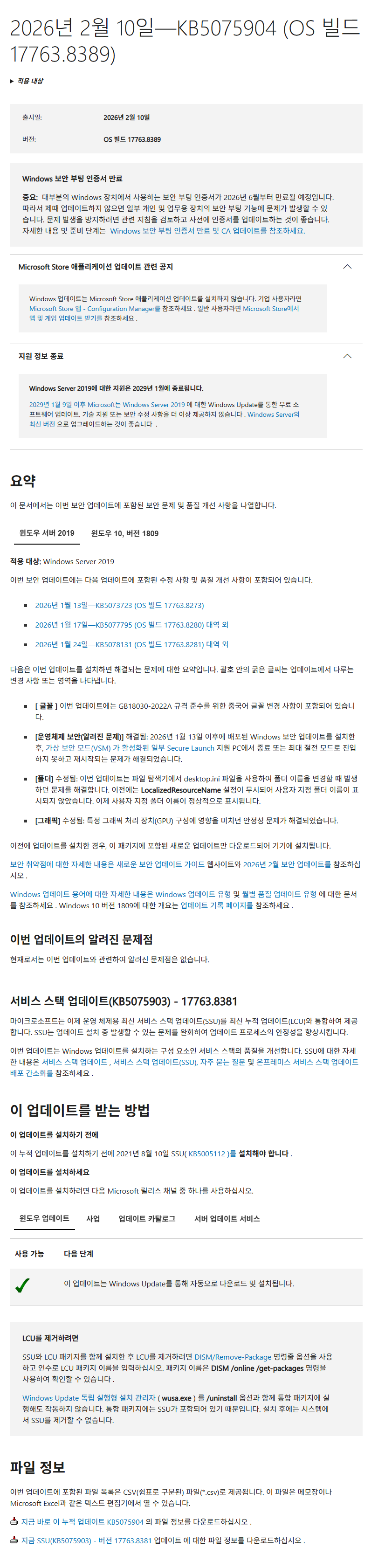 KB5075904 = 최신 누적 업데이트(17763.8389) (Last Cumulative Update : LCU) (2026-02-10)