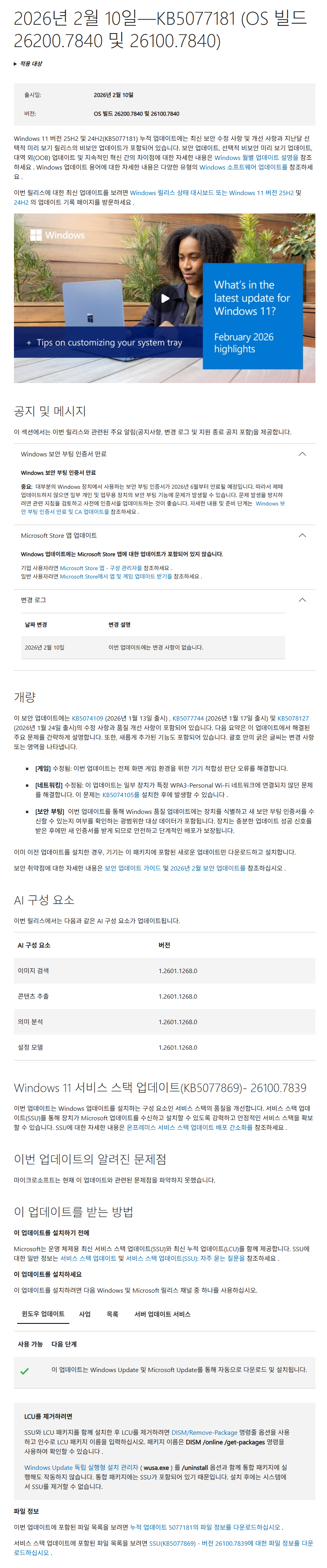 2026-02 Windows 11 Version 24H2, 빌드 26100에 대한 누적 업데이트(KB5077181) : 26100.x → 26100.7840