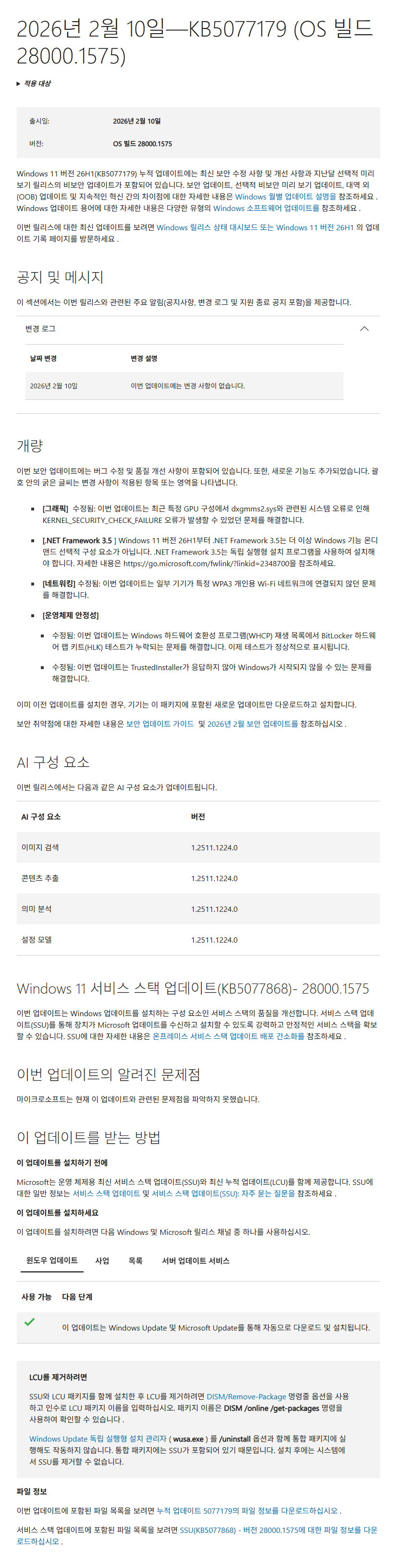 KB5077179 = 최신 누적 업데이트(28000.1575) (Last Cumulative update : LCU) (2026-02-10)