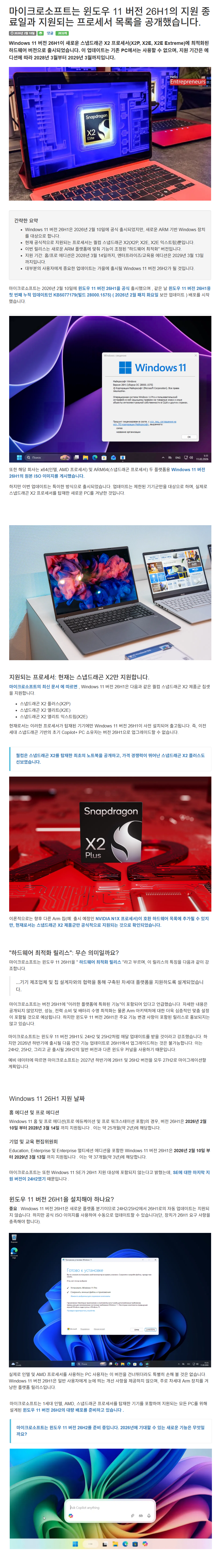 마이크로소프트는 윈도우 11 버전 26H1의 지원 종료일과 지원되는 프로세서 목록을 공개