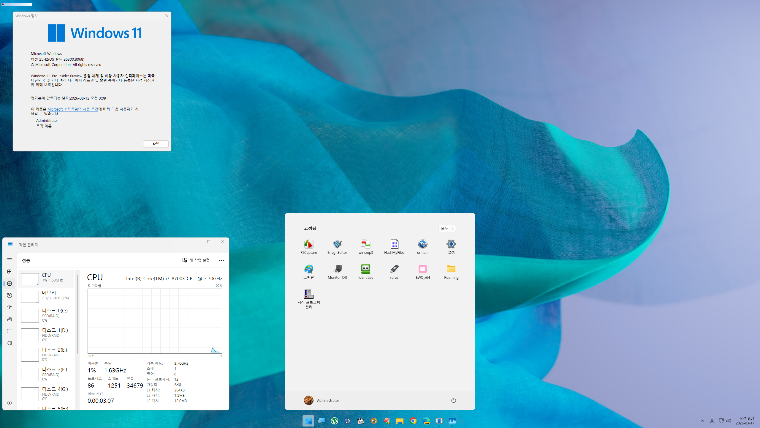 Windows 11 26H2용 Dev 빌드 26300.8068 설치 완료